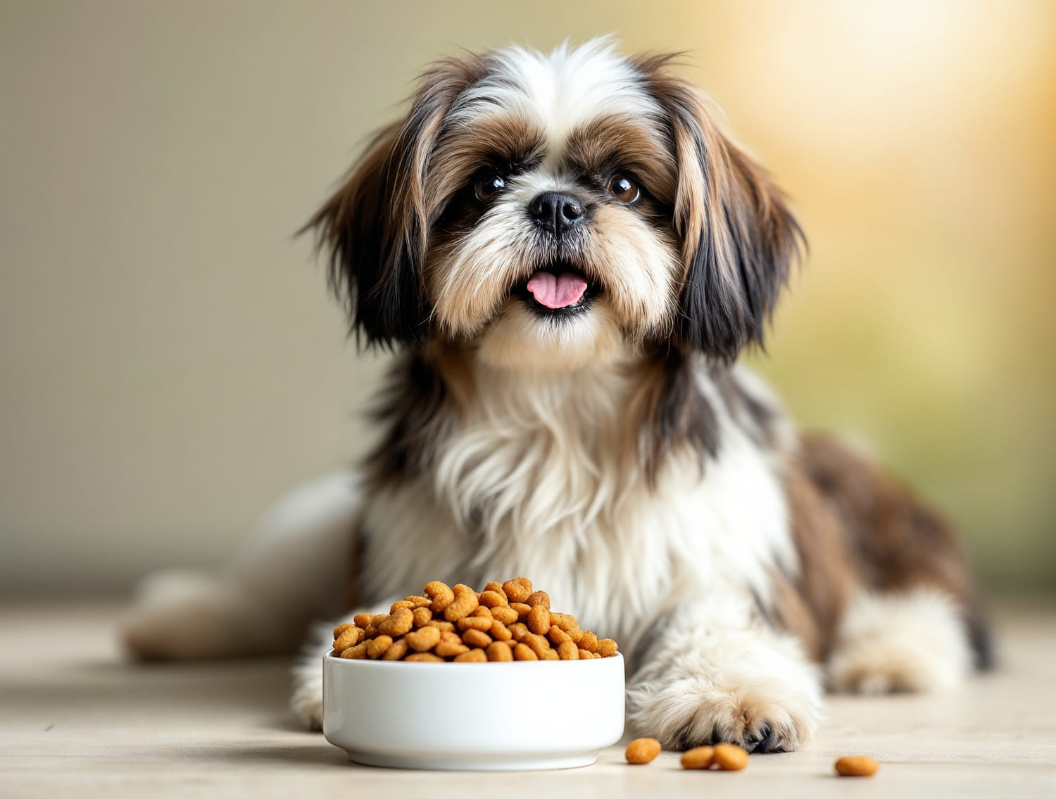 O Shih Tzu tem o focinho “achatado”, uma característica conhecida como braquicefalia. Isso não afeta apenas a respiração, mas também a forma como eles pegam a comida. Croquetes redondos e pequenos podem ser difíceis de agarrar, tornando a alimentação uma experiência frustrante.